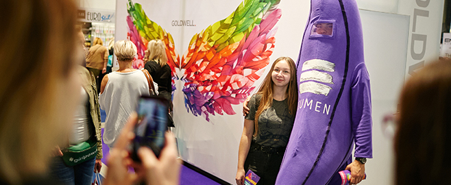 Połączenie barwnych atrakcji i sporej dawki merytoryki – stoisko Goldwell przyciągało! 2,5-metrowa maskotka w postaci fioletowego banana zrobiła furorę wśród odwiedzających! Sporym zainteresowaniem cieszyły się kolorowe skrzydła o rozpiętości aż 4 metrów, na tle których można było zrobić jedyne w swoim rodzaju zdjęcie. Atrakcji dopełniały kreatywne stacje malarskie, gdzie rolę farby przyjął Elumen Play!