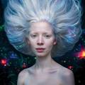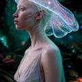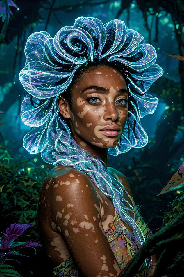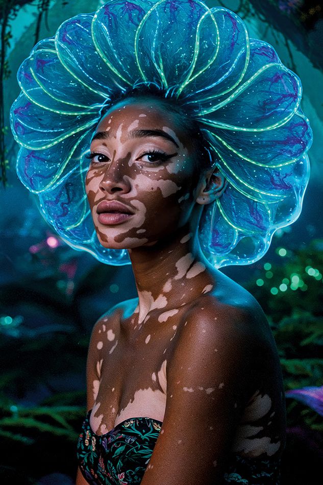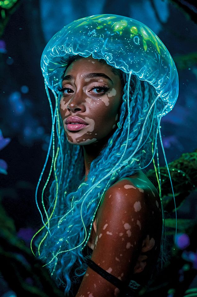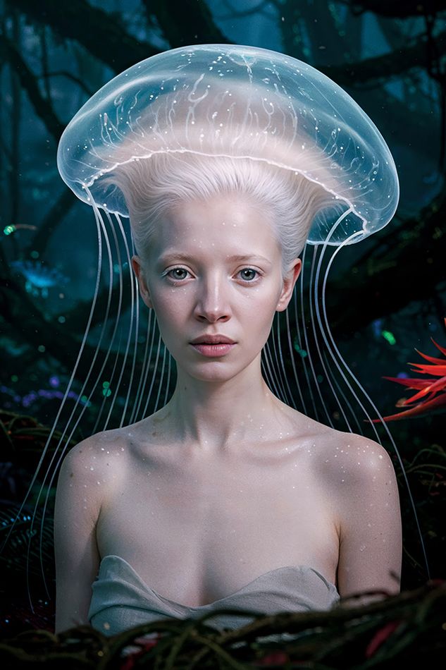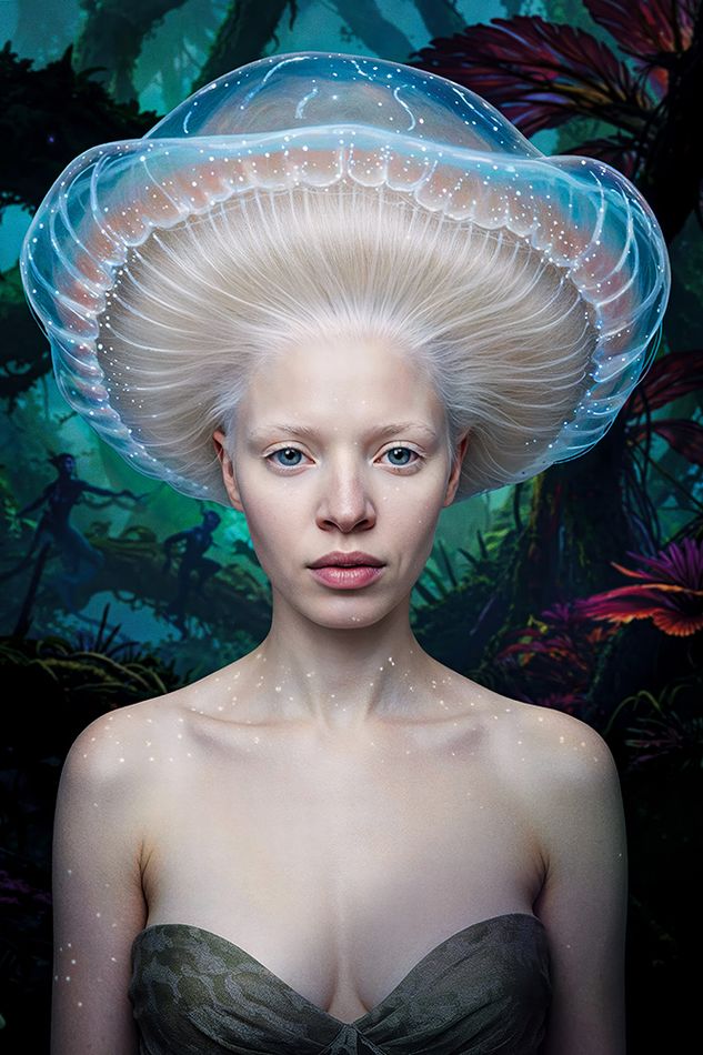 Włosy ożywają dzięki falującym, półprzezroczystym i bioluminescencyjnym teksturom, naśladującym gatunki wodne, takie jak Aurelia aurita (meduza księżycowa). Kosmyki rozciągają się i wyginają w surrealistyczny sposób, jakby reagowały na niewidzialne prądy, nadając obrazom oniryczny i podwodny charakter. Paleta kolorystyczna zdominowana jest przez elektryczne i wodne odcienie: błękity, fluorescencyjne tony, perłowe i opalizujące biele. Kolory te zdają się świecić od wewnątrz, odwzorowując efekt morskiej bioluminescencji.